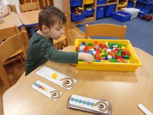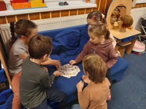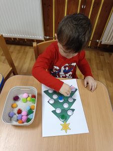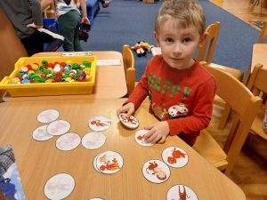 Motivací tohoto týdne se stal dopis od Ježíška. Kouzelné psaní dorazilo k dětem hned v pondělí. Ježíšek dětem připomněl, jak je důležité být k sobě laskaví, pomáhat druhým a těšit se z kouzelné vánoční atmosféry. V dopise děti vyzval, aby si udělaly Strom dobrých skutků a každý den na něj přidaly lísteček s dobrým činem. V úterý jsme si přečetli vánoční příběh. V uchopitelné formě jsme si vyprávěli o cestě Josefa a Marie do Betléma. Seznamování s lidovými tradicemi je krásný způsob, jak dětem předat kulturní dědictví a hodnoty. Nezapomněli jsme si představit několik jednoduchých zvyků. Rozkrojení jablíčka nám předpovědělo štěstí a zdraví na příští rok. Jablíčka jsme dále využili při třídění, počítání a porovnávání. Na závěr nechyběla společná ochutnávka. Povídali jsme si o vánočních přáních, a o tom, co by si děti přály do nového roku. K Vánocům bezesporu patří cukroví. Oblast jemné motoriky jsme procvičili při vyvalování těsta a vykrajování perníčků. Do programu jsme zařadili pohádku O Perníkové chaloupce, s níž jsme pracovali formou čtení, rozhovorů a her. Pohádku jsme ukončili ochutnávkou našich upečených perníčků. Dětem byl po celý týden poskytnut dostatek prostoru pro spontánní hru, která má zásadní přínos ve vzdělávání.