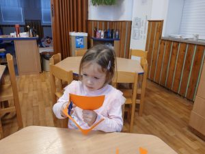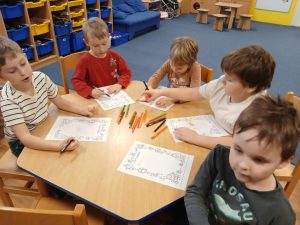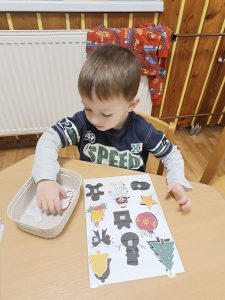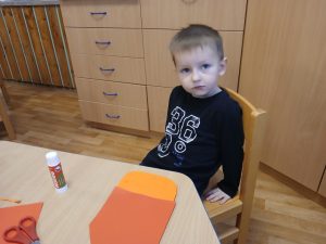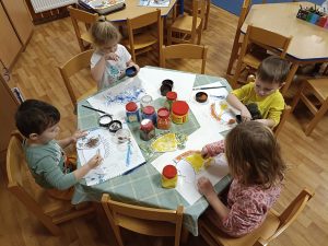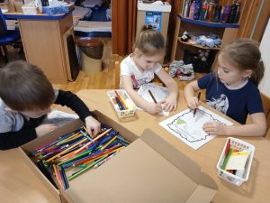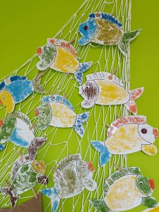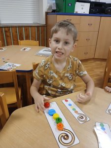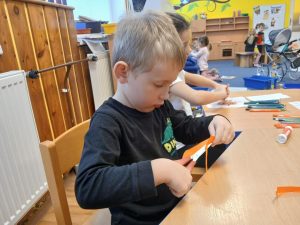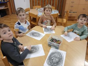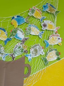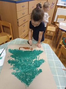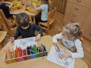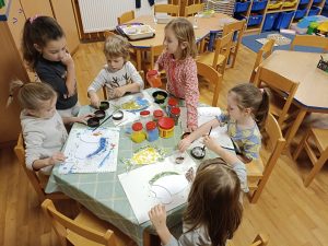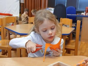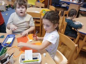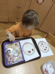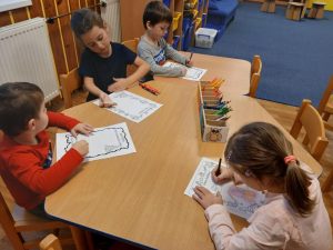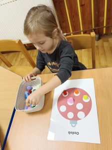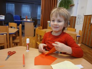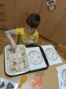 Výtvarná činnost: kapřík – práce s připravenou šablonou, tekutým lepidlem a barevným pískem (procvičen špetkový úchop, dbáno na pečlivost při přechodu do jednotlivých částí těla v šabloně)