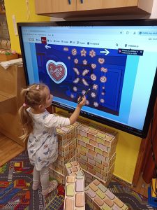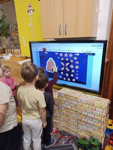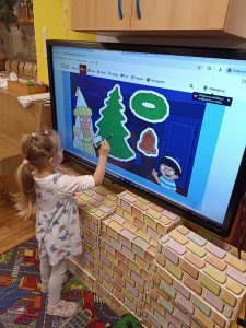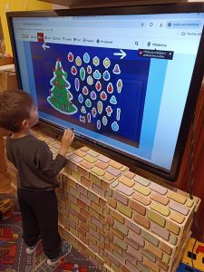 Plníme vánoční úkoly na interaktivní tabuli – procvičeno logické myšlení, zrakové vnímání a spolupráce při řešení her s vánoční tematikou